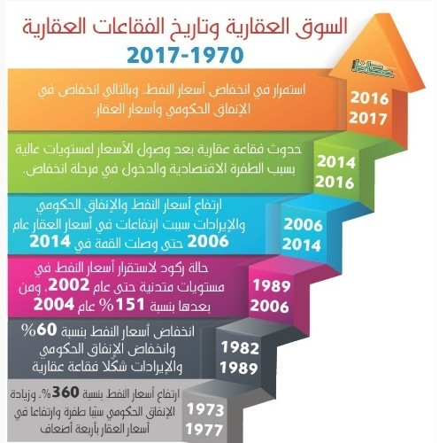 توقع تقرير عقاري حديث انخفاض أسعار العقار لفترة قد تستمر من 4-7 سنوات، ومن ثم الدخول في حالة ركود لسنوات عدة، استنادا إلى حدوث فقاعات عقارية بسبب ناطحات السحاب وقرار رسوم الأراضي البيضاء، وارتباط أسعار العقار بالنفط، والإنفاق الحكومي. وأشار التقرير الصادر عن إحدى الشركات المتخصصة في العقار ويحمل عنوان «نظرة تحليلية لفقاعة العقار» إلى أن المتابع لتاريخ الفقعات العقارية في السوق العقارية العالمية والسوق السعودية يلاحظ أنه في حال اتبعت فقاعة العقار الحالية الفقاعة السابقة بجميع أحوالها ومتغيراتها، فقد يمتد الانخفاض إلى 7 سنوات بنسبة تصل